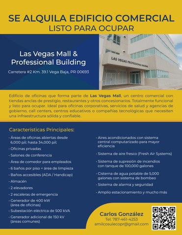 SE ALQUILA EDIFICIO COMERCIALLISTO PARA OCUPARLas Vegas Mall & Professional BuildingCarretera #2 Km. 39.1 Vega Baja, PR 00693Edificio de oficinas que forma parte de Las Vegas Mall, un centro comercial con tiendas anclas de prestigio, restaurantes y otros concesionarios. Totalmente funcional y listo para ocupar. Ideal para oficinas corporativas, servicios de salud y agencias de gobierno, call centers, centros educativos o compañías tecnológicas que necesiten una infraestructura sólida y confiable...