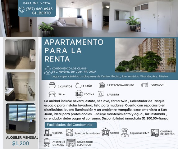 Acogedor apartamento de 2 cuartos y 1 baño, con 1 estacionamiento , ubicado en El Condominio Los Olmos. Lugar céntrico a solo pasos del Centro Médico.• La unidad incluye nevera, estufa, set love, cama twin , calentador de tanque, espacio para instalar lavadora, lista para mudarse. • Cuenta con espacios bien distribuidos, buena iluminación y un ambiente tranquilo, excelente vista a San Juan, ideal para profesionales, estudiantes. • El condominio ofrece piscina, salón actividades, gazebo, segurida...