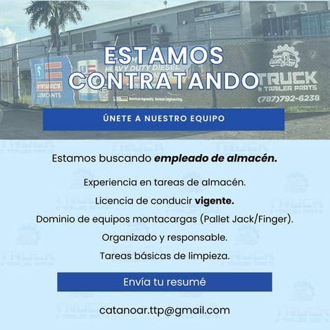 Entregar y recoger piezas de mercancía de manera rápida y puntual. Asistir con la organización, recibo y despacho de inventario en el almacén. Capacidad para realizar esfuerzo físico. Mantener la limpieza de las áreas comunes de trabajo. Compromiso con el horario (7:30am- 4:00pm L-V y 8:00am-12:00pm los sábados). Licencia de Conducir Vigente (¡INDISPENSABLE!) y récord choferil. Certificado de Buena Conducta Dominio de equipos montacargas (Pallet Jack / Finger) Envía tu resumé a catanoar.ttp@gmai...