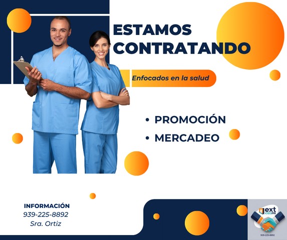 Empresa internacional establecida en la isla dedicada a la promoción y mercadeo enfocado en la salud y calidad de vida, busca nuevos Promotores de la Salud. Plazas disponibles para los pueblos de Salinas, Santa Isabel, Coamo, Villalba, Juana Díaz, Ponce y pueblos limítrofes. No se requiere experiencia previa. Mayores de 18 años. Interesados favor enviar CV a nextjobspr@gmail.com o vía WhatsApp al 939-225-8892, Sra. Ortiz Comienzo inmediato