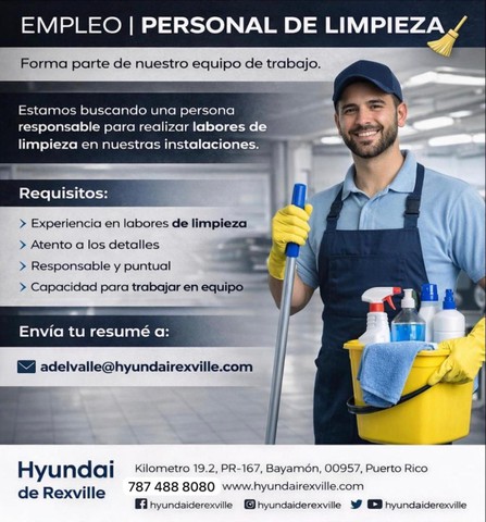 EMPLEO – PERSONAL DE LIMPIEZAEstamos buscando una persona responsable para realizar labores de limpieza en nuestras instalaciones.Requisitos:Experiencia en labores de limpiezaAtención a los detallesResponsable y puntualCapacidad para trabajar en equipoInteresados:Enviar su resumé a adelvalle@hyundairexville.com