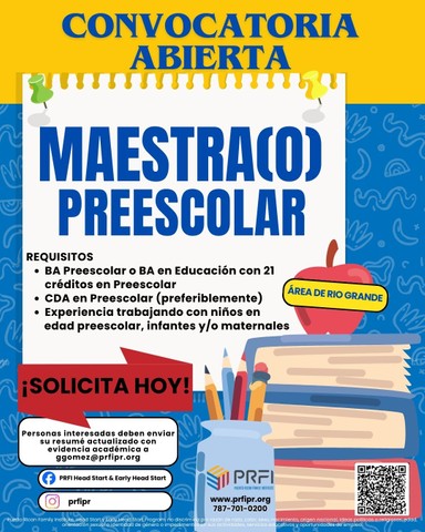 El/La Maestra(o) Preescolar es responsable de la supervisión directa en todo momento de los niños a su cargo. Planifica y desarrolla diariamente objetivos y actividades apropiadas para los niños. Observa e identifica necesidades y hace los referidos pertinentes de ser necesario. Completa y mantienen al día los documentos relacionados a los niños, entre otras tareas a fin a su puesto.Salario Mensual de $2,654.00Horario de Trabajo de lunes a viernes de 7:30 am a 4:30 pm con una hora para tomar a...