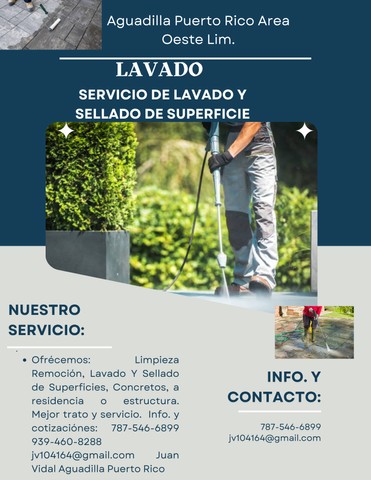 Ofrécemos: Limpieza Remoción, Lavado Y Sellado de Superficies, Concretos, a residencia o estructura. Mejor trato y servicio. Info. y cotizaciónes: 787-546-6899 939-460-8288 jv104164@gmail.com Juan Vidal Aguadilla Puerto Rico Area Limitrofes.