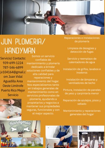 Reparaciones e instalaciones de plomeríaLimpieza de desagües y detección de fugasServicio y reemplazo de calentadores de aguaInstalación de grifos, lavabos e inodorosInstalación de lámparas y ventiladores de techoPintura, instalación de paneles de yeso y carpintería menorReparación de azulejos, pisos y selladoMantenimiento y reparaciones generales del hogar