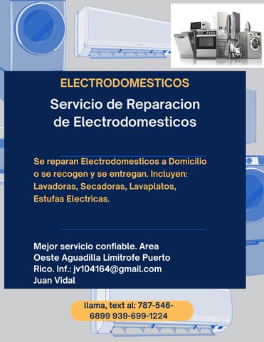 Reparacion de Enseres. Reparacion de lavadoras, lavaplatos, Neveras, Secadoras. Area Oeste Limitrofe Puerto Rico 9396991224; WhatsApp: 7875466899. Juan.